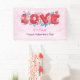 Ein Valentinstag-Banner mit Liebe in einem kühnen Schriftart im Blockstil, umgeben von Herzen und schönen Blume. Erschaffen mit Aquarellen. Hellrosa gemusterter Hintergrund.