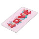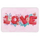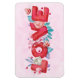 Ein flexibler Magnet mit Liebe in einem kühnen Schriftart im Blockstil, umgeben von Herzen und schönen Blume. Erschaffen mit Aquarellen. Hellrosa gemusterter Hintergrund.
