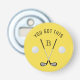 Dieser runde Flaschenöffner kann mit Ihrem Monogramm personalisiert werden. Sie können auch die Beschriftung bearbeiten oder die Standardeinstellung "DIES GOT" verwenden. Das Design umfasst auch gekreuzte Golfclubs und zwei Golfbälle auf einem hellgelben Hintergrund.