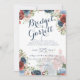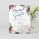 Eleganter handgeschriebener Designertext mit blauen und bordeauxfarbenen Blume Hochzeitseinladung.