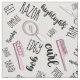 Ein nahtloses Muster verschiedener Friseurwerkzeuge, wie Scheren, Kämme und Clippern, kombiniert mit einer Wortwolke aus der gängigen Friseurterminologie in einem weichen Bubenlegum-Rosa und Holzkohle, geeignet für jede beliebige helle Hintergrundfarbe. Suchen Sie ID749 um weitere Farboptionen und Produkte mit diesem Muster zu sehen.