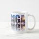 Riga Text bestehend aus Foto des berühmten Hauses der Blackheads und Roland's Statue auf schwarzem Hintergrund mit Texterkennung im Wasser. Sonnenuntergang überdacht im Schnee Riga Riga Rathausplatz im Winter, Lettland.