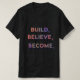 Music Texte T - Shirt Slogan "Build, Glaube, Become" ist in fett geschrieben, sans-serif Schriftart. Die Wörter werden vertikal gestapelt, oben "bauen", in der Mitte "glauben" und unten "Werden". Farbschema: Der T - Shirt weist einen Farbverlauf auf, der von tiefblau zu hellerem Türkis übergeht. Der Text ist in Weiß geschrieben, um maximale Sichtbarkeit zu gewährleisten.