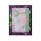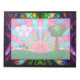 Ein digitales Buntglasdesign im Art-Déco-Stil, das im 20. Jahrhundert beliebt war. Das weithin verwendete Sonnenburstmotiv ist zentral und erhebt sich hinter einer grünen Landschaft, die von einem Baum auf der einen Seite und Wolken und Blume auf der anderen Seite ausgeglichen wird. Geometrische Formen werden verwendet, um die Symmetrie der Szene zu betonen, wobei der Baum und die Wolken aus überlappenden Kreisen bestehen. Verschiedene farbenfrohe Fraktal verleihen der "gläsernen" Textur und dem Interesse. Die Szene ist gerahmt in schwarzen Eisenarbeiten und diamantförmigen Blöcken, mattiert mit dunklen, aber lebendigen Fraktal-Mustern.