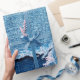 Texturierter Denim Hintergrund. Ein gewundenes Loch in den Stoff. Blaue Töne