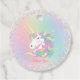 This favor tag has an enchanted unicorn with a flowing multicolor mane on a soft watercolor rainbow wash with sparkle accents and customizable text. This whimsical fantasy design creates a magical look for a girl’s birthday celebration.