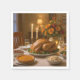 A warmly lit dining table, beautifully decorated for Thanksgiving, is visible through a window, featuring a roasted turkey, pumpkin pie, and a variety of side dishes