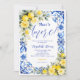The back of the invitation continues the blue tile and watercolor lemon floral design, creating a cohesive and polished stationery set. Easily personalize with your event details to create a memorable and beautifully styled bridal shower invitation.