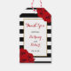 Die schicke, moderne Luxus-Hochzeitskollektion besticht durch einen klassischen schwarz-weißen Streifen-Hintergrund, der durch hübsche rubinfarbene rote Rosen und ein vergoldetes Imitat-Folienrahmen betont wird. Diese Tags sind leicht zu personalisieren und sind das perfekte Zubehör für jede Hochzeit, jedes Brautparty, jede Geburtstagsfeier, jede Verlobung oder jeden anderen besondere Anlass.