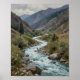 This evocative oil painting depicts a winding glacial river cutting through a rugged mountain valley. The artist uses a cool palette of blues and whites to illustrate the churning, rapid movement of the water as it flows over smooth river stones and large boulders. In the foreground, the detail of the rocky bank and low-lying shrubs provides a sense of immediacy, while the mid-ground transitions into dense green thickets and scattered pines. The background is dominated by towering, misty peaks that fade into a soft, overcast sky, using aerial perspective to create a profound sense of depth and scale. The overall mood is one of tranquil power, highlighting the timeless beauty of an untouched wilderness.