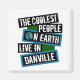 This design features bold, layered text with the phrase "The Coolest People on Earth Live in Danville" in a striking cool color palette. A globe graphic, integrated with coordinating blue and green blocks, symbolizes the city's global appeal. The design is suitable for showcasing local pride, as it boldly declares Danville's unique charm as a popular city in the northern California area. Colorful eye-catching visuals serve to foster a sense of community and identity among residents.
