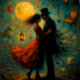 Step into a whimsical world where love meets the surreal. This enchanting decoupage paper features a couple locked in an intimate embrace beneath a glowing moon, surrounded by floating objects—a rocking horse, vintage chairs, ribbons, butterflies, and a teacup. His form dissolves into the night while her red dress flutters like fire. Perfect for dreamy mixed media, altered books, romantic crafts, or magical storytelling projects.