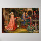 In “The Enchanted Garden,” John William Waterhouse places us in a secluded courtyard where nature feels carefully tended but quietly untamed. Stone arches and warm walls frame a lush canopy of leaves and climbing branches, heavy with blossoms and scattered fruit, as if the garden itself is alive and watchful. Light filters through the greenery in soft patches, catching on petals, carved masonry, and the smooth surface of a fountain, turning the space into something halfway between a real place and a dream.