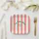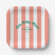 Elevate your 50th birthday celebration with The Fifty Club Pink Cabana Stripe Party Paper Plates, featuring green retro lettering set against chic peach cabana stripes, these customizable plates are perfect for elevating your 50th birthday decor, adding a fun, coastal vibe these plates can be fully personalized with your custom date and destination. Whether you're hosting a beach bash, poolside gathering, or chic destination party, these paper plates bring personality and charm to every table.