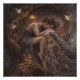 A woman with a flower crown sleeps peacefully inside a hollow tree trunk, surrounded by glowing fairies, a hanging lantern, and magical forest elements like mushrooms and moss.