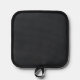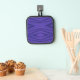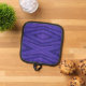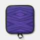 "Two images of a square potholder. The front shows a purple geometric pattern with diamond shapes, and the back is plain black with a loop for hanging."