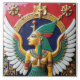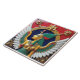 A square tile with a relief of a fair-skinned Egyptian woman, around 25 years old, in profile, facing left, with green hair, wearing a gold headdress with green and red accents, and a gold necklace. She has large white wings with green and red accents. The background is a red square with a blue circle in the center. The circle is surrounded by a gold ring with Egyptian hieroglyphs. Above the circle is a gold ram's head.