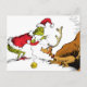 This hilarious illustration captures the precise moment the Grinch decides his dog needs an upgrade! The Grinch, dressed in his full, fuzzy Santa suit, is meticulously tying a single reindeer antler onto the head of his dog, Max, using a piece of string or yarn. Poor Max looks utterly resigned to his fate as the "reluctant reindeer." This fun, classic illustration perfectly highlights the absurd and mischievous planning behind the famous Christmas heist!