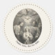 A round sticker featuring a vintage graphic of the two Trinities, The Holy Trinity of Father, Son and Holy Ghost and the Holy Family, of Jesus, Mary and Joseph, with the Latin prayer, Familia Sacra, Ora Pro Nobis, Holy Family, Pray For Us. Thanks for looking!