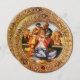 Die Doni Tondo oder Doni Madonna, die Kunst der Renaissance, Meisterwerk des italienischen Renaissance-Meisters Michelangelo Buonarroti in seinem ursprünglichen Rahmen.Der Rahmen ist ornig geschnitzt und eher ungewöhnlich für die fünf Köpfe, die er enthält, die dreidimensional in den Raum ragen.Im Uffizi in Florenz, Italien, in hellgelb, weiß, blau, rot, grün, grün, grün, braun, braun, braun Künstlerisches Design mit einem leuchtend roten, roten Schmuckstein in 3D.