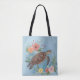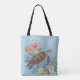 The illustration of a sea turtle gliding through clear blue water, surrounded by colorful marine life.