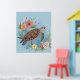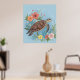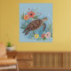 The illustration of a sea turtle gliding through clear blue water, surrounded by colorful marine life.