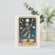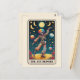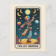 Verbreiten Sie gute Laune und feiern Sie mit der Tarot-inspirierten Kunstkarte 'The Joy Bringer'. Diese unglaublich einzigartige Illustration zeigt ein tanzendes Skelett, das einen kühnen, regenbogenfarbenen Clownanzug vor einem lebendigen, sternenklaren Nachthimmel trägt.