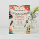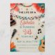 Vibrant, bohemian-chic 14th birthday invitation for "Ophelia," featuring a "Showgirl Birthday" theme with musical elements like a record player and microphone, accented by coral, teal, feathers, and beads.