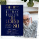 His life has been a great adventure! This fabulous navy blue men's 80th birthday surprise party invitation that says "The Man The Myth The Legend" in a classic font in silver and gold would be perfect for asking people to join you as you celebrate the man in your life's 80th birthday. This invitation is trendy, stylish, modern and contemporary. The photo on the back makes it just that much more special. To see your unique invitations select "Personalize this template" and type in your information and upload a favorite photo. It's super easy!