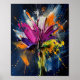 The composition is dominated by a burst of magenta, deep violet, and vibrant orange petals that seem to shatter against a dark, moody navy-blue background. The technique utilizes heavy palette knife work, giving the "flower" a 3D sculptural quality with visible ridges and peaks of wet-look acrylic or oil.