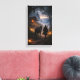 A lone traveler leads his horse through the misty forest toward a small cabin glowing in the distance. Lanterns light the path like silent guides, while mountains fade into the evening haze. This artwork captures a moment of calm after a long journey — a place that feels like shelter, memory, and home all at once. It speaks about solitude, endurance, and the quiet hope found at the end of the road.