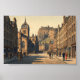 This is a drawing of the Royal Mile at Edinburgh in Japanese woodblock print (ukiyo-e) style printing. The Royal Mile is the historic spine of Edinburgh's Old Town, stretching about one mile between Edinburgh Castle and the Palace of Holyroodhouse. It is a bustling, historic street famous for its medieval atmosphere, cobbled streets, and narrow closes.