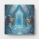 Two silver-haired mermaids guard a crystalline staircase that leads into a glowing underwater sanctuary.
