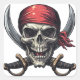 Arrgghh das Meer mag ruhig sein, aber die Atmosphäre in der Sea Dog Tavern ist rau. Diese Grafik zeigt einen Pirat-Schädel mit einem roten Kopfschuss und kreuzenden Schwertern.