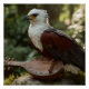 At the edge of a quiet woodland clearing, a great bird of prey rests upon a moss-covered stone. Its white crown catches the filtered sunlight, while chestnut wings fold with calm authority. Beneath its talons lies a finely carved stringed instrument, untouched yet full of promise.