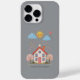 Esta encantadora ilustración captura la esencia de la felicidad y la calidez. La imagen muestra una pequeña casa blanca con detalles rojos, rodeada por árboles con hojas en forma de corazón y flores amarillas que dan vida al paisaje. Sobre el tejado, un perro sonriente observa la escena, mientras que en el cielo, un sol radiante y sonriente derrama luz sobre todo.