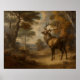 A stag stands proudly in a sunlit forest path surrounded by autumn foliage. The scene captures the serene beauty of nature in a tranquil moment.