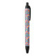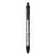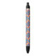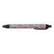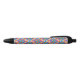 A colorful pen with a black tip and clicker, featuring a vibrant, geometric pattern on the barrel. The tone is cheerful and playful.