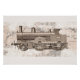 A very old and original steam locomotive stands proudly on its weathered rails, every bolt and rivet telling a story from a bygone era. Bathed in a warm sepia tint, the engine glows with vintage charm, its iron body worn yet dignified, its great steel wheels still poised as if ready for one more journey. Soft wisps of steam curl around its chimney, drifting upward like memories rising from the past. The aged brass fixtures, faded lettering, and soot-kissed panels complete a scene that feels timeless, nostalgic, and full of quiet power. It is a monument to the early days of rail travel, captured in a print that looks lovingly preserved from another century. This wall art poster will surely adorn any wall as a framed print in any home.