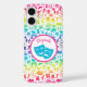 iPhone-Gehäuse mit feuertem Regenbogen-farbenem Muster theaterbezogener Ikonen auf weißem Hintergrund, mit aquafarbenen Drama-Masken in einem Kreis, in dem Sie einen Namen, Datum, Initialen, etc. hinzufügen können, um diesen Fall für Ihren Lieblings-Theater-Liebhaber zu personalisieren. Zu den Ikonen zählen: Shakespeare, Drama-Masken, Mikrofon, Musiknoten, Regisseursstuhl, Tickets, Sterne, Bühne-Vorhänge, Spotlight, Rose und vieles mehr.