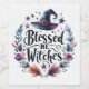 Dieses skurrile Weinetikett zeichnet sich durch einen lustigen Blumendruck mit den Worten "Gesegnet sein Hexen" aus.