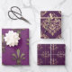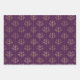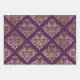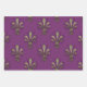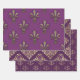 Lila und goldene Pariser Umhüllungspapier in drei verschiedenen Stilen, darunter Rose-Damast, Fleur-de-lis und Kronleuchter.
