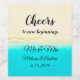 Hübsches personalisiertes Weinflaschenlabel mit hübscher Meeresküste, aquamarines Wasser, Sandstrand, der "Cheers" mit dem Hochzeitstag und Brautnamen und Bräutigamen sagt.