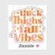 Dieses lebhafte und spielerische Falldesign besticht durch die lustige und selbstbewusste Phrase "Thick Thighs Fall Vibes" in einem kühlen, Retro-inspirierten Schriftart. Der Text ist in einem dynamischen, gestapelten Layout angeordnet, wobei jedes Wort in warmen Herbsttönen mit Orange-, Pfirsich- und Weichrosa-Farbtönen gefüllt ist. Die sternähnlichen Glitzern in der Umgebung sorgen für eine Touch von Lustigkeit und Glanz, die das festliche und gemütliche Ambiente des Designs unterstreicht. Die Typografie ist gewagt und kurvig, was ihr eine lebendige, Vintage Anziehungskraft verleiht, die das Wesen des Herbstes perfekt einfängt.