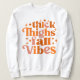 Dieses lebhafte und spielerische Falldesign besticht durch die lustige und selbstbewusste Phrase "Thick Thighs Fall Vibes" in einem kühlen, Retro-inspirierten Schriftart. Der Text ist in einem dynamischen, gestapelten Layout angeordnet, wobei jedes Wort in warmen Herbsttönen mit Orange-, Pfirsich- und Weichrosa-Farbtönen gefüllt ist. Die sternähnlichen Glitzern in der Umgebung sorgen für eine Touch von Lustigkeit und Glanz, die das festliche und gemütliche Ambiente des Designs unterstreicht. Die Typografie ist gewagt und kurvig, was ihr eine lebendige, Vintage Anziehungskraft verleiht, die das Wesen des Herbstes perfekt einfängt.