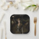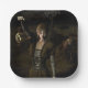 Thin female carrying a lamp and a bone through woods at night, with a dog as a companion.