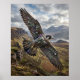 A striking thistle falcon soars above dramatic cliffs where speed and botanical power unite. Sleek falcon anatomy merges with silver thistle blooms, rugged leaves, and textured feathers across its wings, chest, and tail. Rolling heather fields, distant mountains, moving clouds, and shafts of sunlight create expansive cinematic depth. This bold fantasy bird design adds motion and strength to offices, modern interiors, studies, or gift collections. Perfect for falcon lovers, mountain decor fans, and wildlife art collectors seeking refined statement pieces.