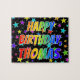 Dieses pulsierende und lustige, zum Geburtstag kommende Puzzle-Design hat die Botschaft "HAPPY BIRTHDAY, THOMAS" mit den Figuren, die ein farbenprächtiges Regenbogenspektrum haben, inspiriertes Farbverlauf, zusammen mit einem spannenden Sternmuster im Hintergrund. Ein farbenfrohes Rätsel wie dieses könnte eine lustige Art sein, Geburtstagswünsche an jemanden namens Thomas zu senden. [~Z0000468]