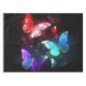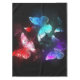 Three luminous, red, purple, green, textured, night butterflies on black luminous background.