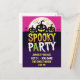 A bold and vibrant Halloween postcard perfect for a spooky party invitation. This vertical design features three glowing jack-o'-lanterns silhouetted under a huge full moon against a dramatic pink and purple sky with flying bats. The large text "SPOOKY PARTY" and clear event details, including "OCT 31" and "8:00 PM" at "THE GHOST HOUSE", make this an unforgettable Halloween event announcement. Use this colorful and exciting card to invite guests, if they dare.